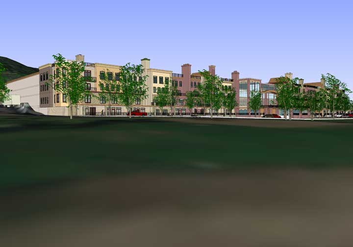 PPD Concept River Center Perspective of Collar Retail on Lower Level with Hotel/Condo/Retail/Offices/Dining on upper 3 floors. Parking Garage is behind the Collar retail.